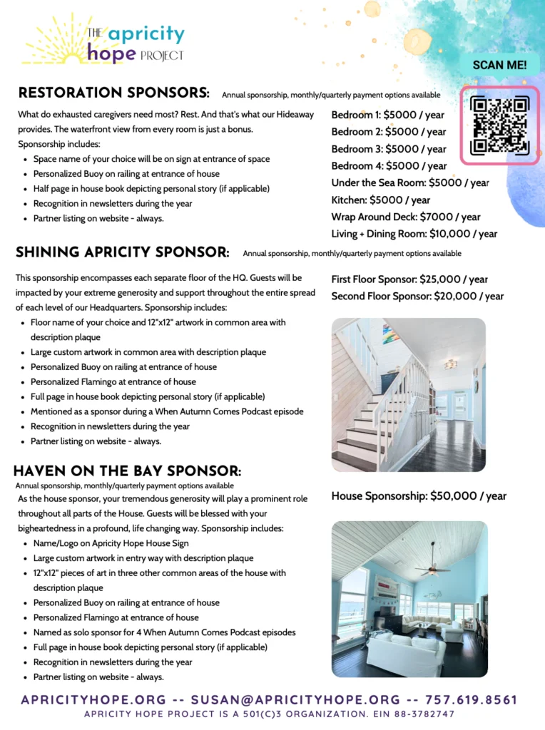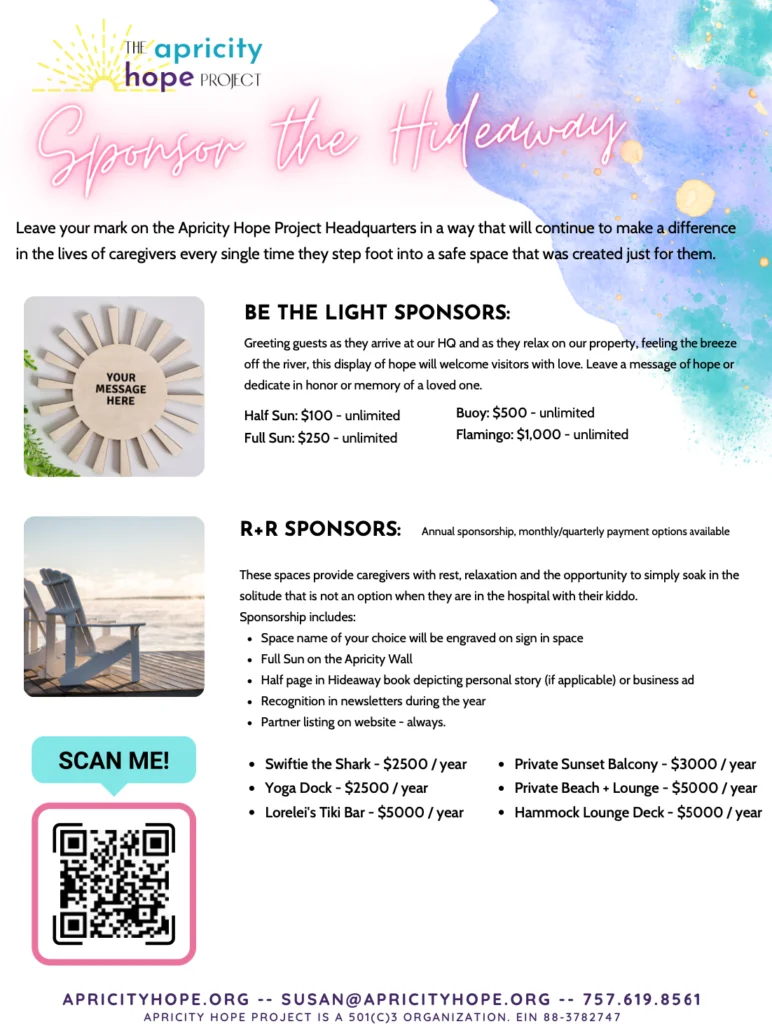 Whether you are an individual, a family or a business – Caregivers need your support. Leave your mark at the Hideaway! We have sponsorship and partnership options that range from $100 to $50,000! You can sponsor a sunshine for our wall of hope, a room that you can name, or even sponsor an entire floor and we will have custom artwork made in your favorite colors!